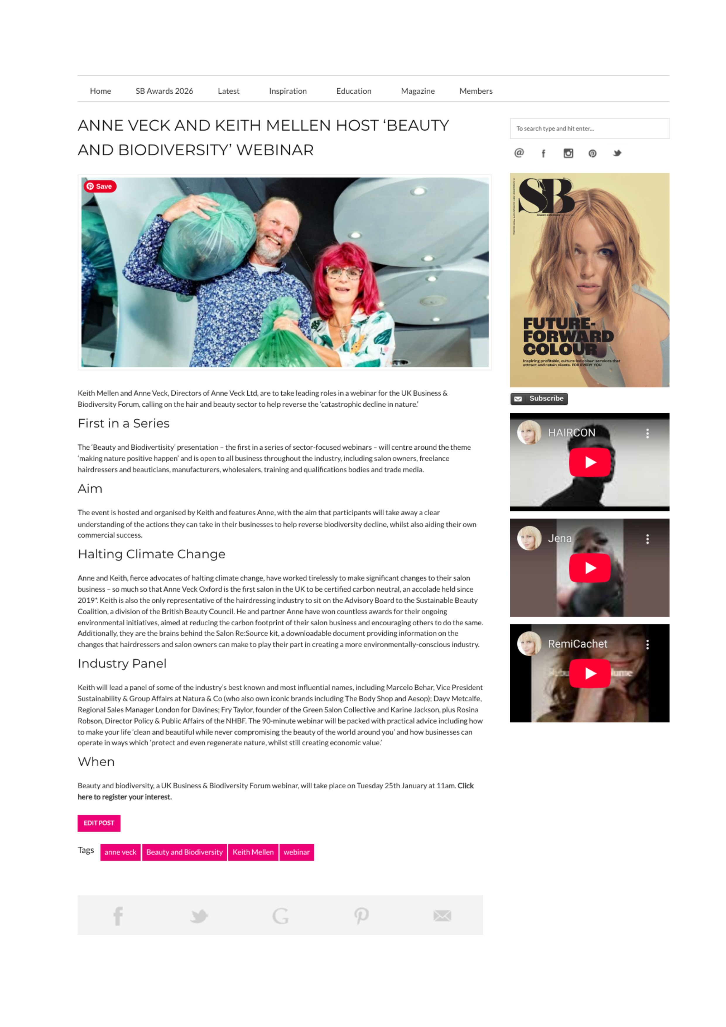 Freelancing for the magazine involves liaising with PR teams to edit and schedule news stories online for its website. Its digital content strategy reflects the brand's eco direction, such as detailing Anne Veck and Keith Mellen’s leading roles in a webinar for the UK Business & Biodiversity Forum. This called on the hair and beauty sector to help reverse the catastrophic decline in nature.