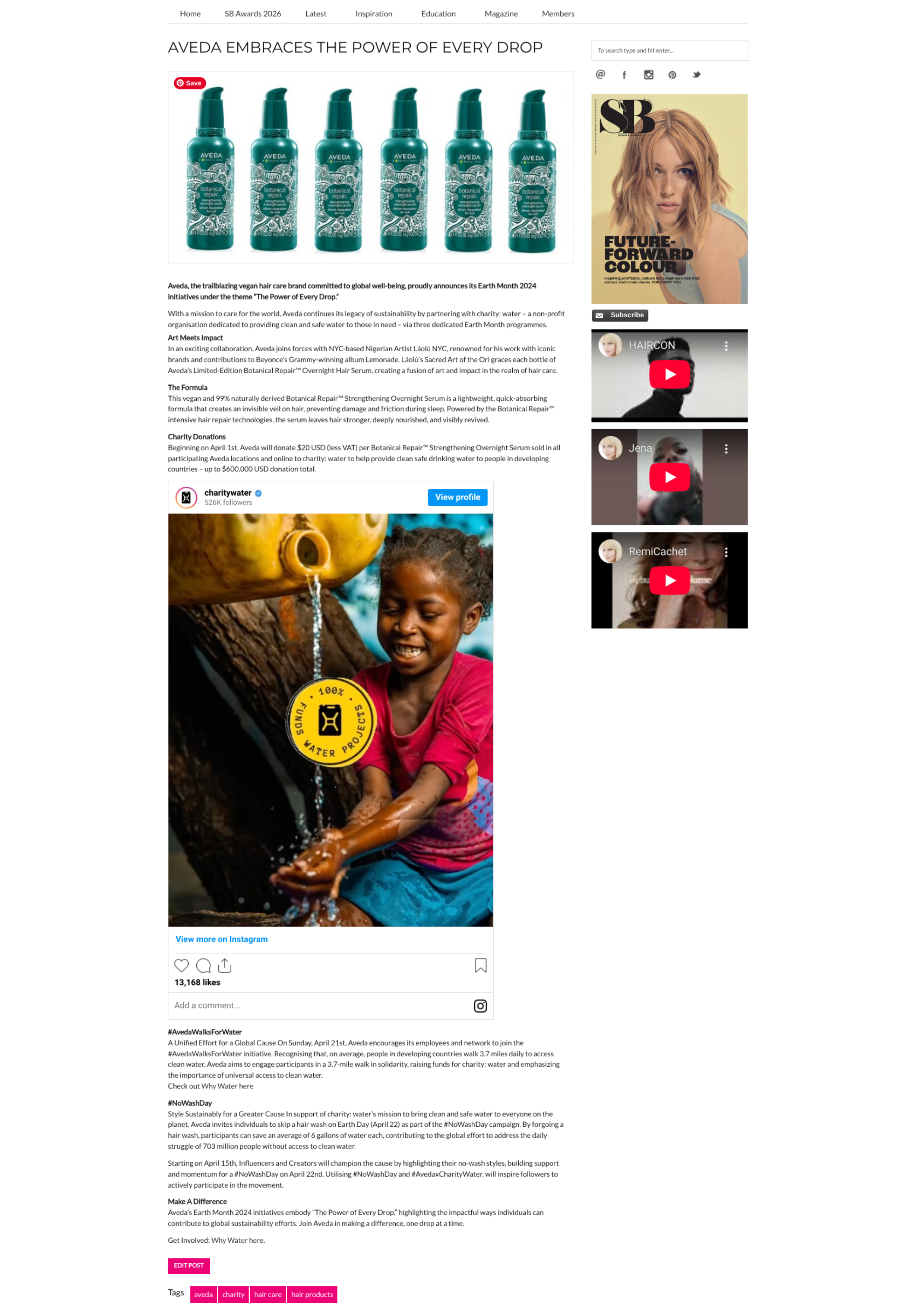 Content has also supported global campaigns such as Earth Month by highlighting brands who are actively supporting it. For example B Corp Certified Aveda's partnership with charity: water (a non-profit organisation dedicated to providing clean and safe water to those in need).