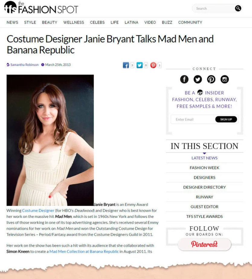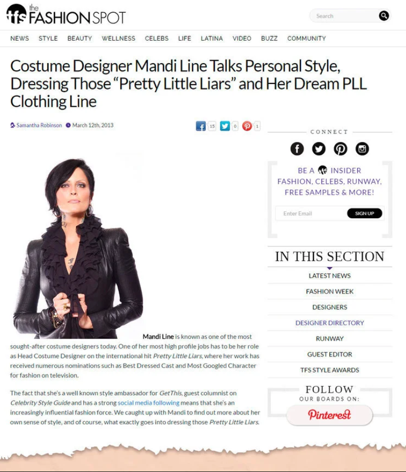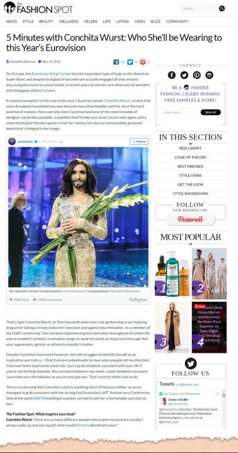 Highlights include attending and reporting from London and Paris Fashion Weeks, and interviews with US Costume Designers Mandi Line of Pretty Little Liars, Janie Bryant of Mad Men, and Eurovision winner Conchita Wurst.