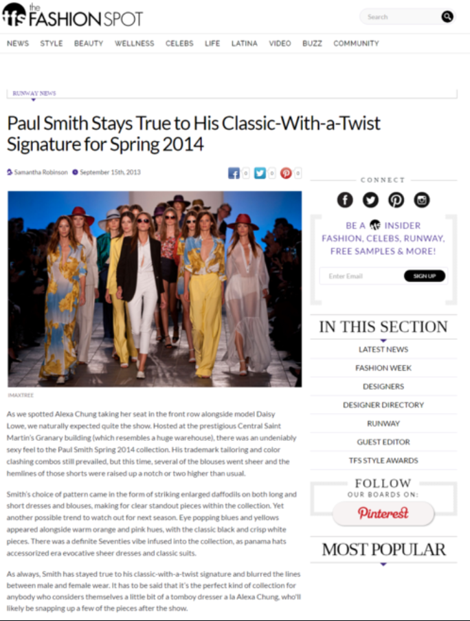 Entertaining an audience of 4.3 million every month, the US founded site is an online destination for fashion, beauty and lifestyle. I was their freelance UK correspondent for several years which involved covering breaking news on a weekly basis as well as attending and reporting from fashion events.